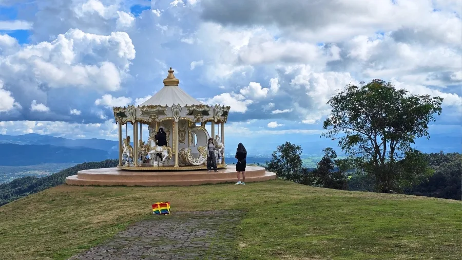ม้าหมุนกลางหุบเขา: นี่คือจุดที่กรี๊ดที่สุด! บนยอดเนินเล็กๆ มีม้าหมุนสีขาวสะอาดตาสไตล์วินเทจตั้งอยู่ ตัดกับสีเขียวของหญ้าและสีฟ้าของท้องฟ้าได้แบบลงตัวสุดๆ ฟีลเหมือนหลุดเข้าไปเป็นเจ้าหญิงดิสนีย์ในดินแดนเทพนิยาย ใครมีชุดกระโปรงฟูฟ่องพกมาด้วยคือได้คอนเทนต์จึ้งๆ กลับไปแน่นอน 🎠