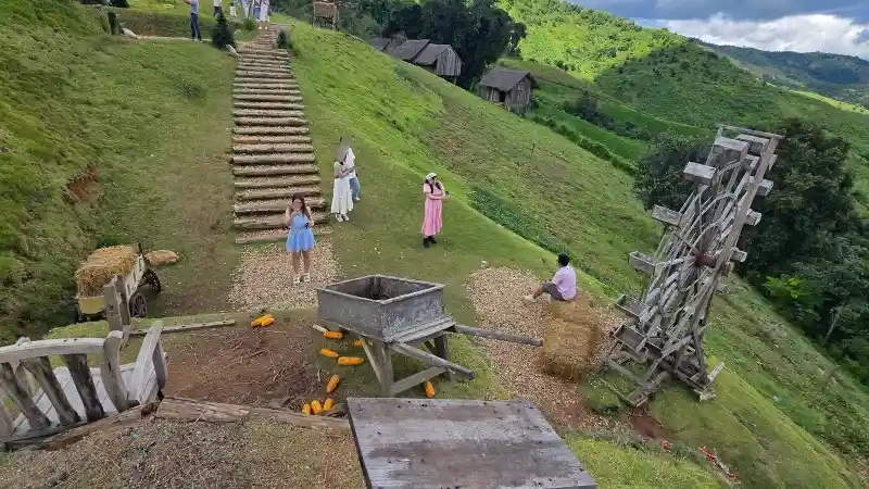 ม้าหมุนกลางหุบเขา: นี่คือจุดที่กรี๊ดที่สุด! บนยอดเนินเล็กๆ มีม้าหมุนสีขาวสะอาดตาสไตล์วินเทจตั้งอยู่ ตัดกับสีเขียวของหญ้าและสีฟ้าของท้องฟ้าได้แบบลงตัวสุดๆ ฟีลเหมือนหลุดเข้าไปเป็นเจ้าหญิงดิสนีย์ในดินแดนเทพนิยาย ใครมีชุดกระโปรงฟูฟ่องพกมาด้วยคือได้คอนเทนต์จึ้งๆ กลับไปแน่นอน 🎠
