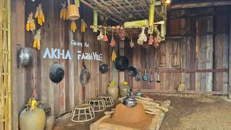 ก้าวแรกสู่โลกของชาวอาข่า (ผสมความนิวซีแลนด์เบาๆ) แค่มาถึงหน้าฟาร์มก็รู้สึกเหมือนได้วาร์ปมาอีกโลกหนึ่งแล้ว จุดแรกที่ต้องเจอคือซุ้มประตูที่ตกแต่งด้วยเครื่องมือเครื่องใช้ของชาวอาข่าแท้ๆ ทั้งข้าวโพดฝักเหลืองอ๋อยที่ห้อยเรียงราย เตาฟืนดินแบบโบราณ หรืออุปกรณ์ทำมาหากินต่างๆ มันไม่ใช่แค่ของตกแต่งนะ แต่มันคือการบอกเล่าเรื่องราวและวัฒนธรรมของที่นี่ไปในตัว แค่ทางเข้าก็กดชัตเตอร์กันไปหลายแชะแล้ว! 📸