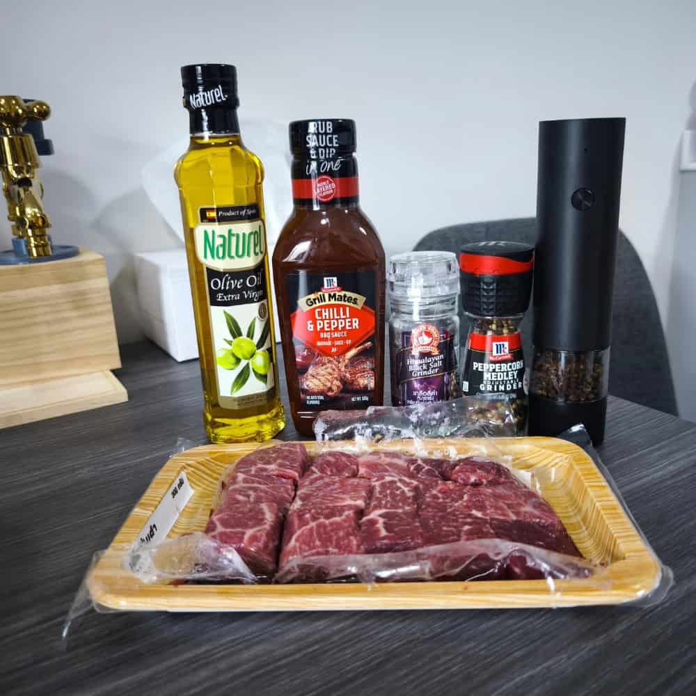 - พระเอกของเรา: เนื้อวัวหั่นเต๋า (ใครชอบส่วนไหน Tenderloin, Sirloin หรือเนื้อเต๋าสำเร็จรูปก็จัดมาเลย) หรือจะเปลี่ยนบทเป็นเนื้อหมู, แซลมอนก็ได้ไม่ว่ากัน