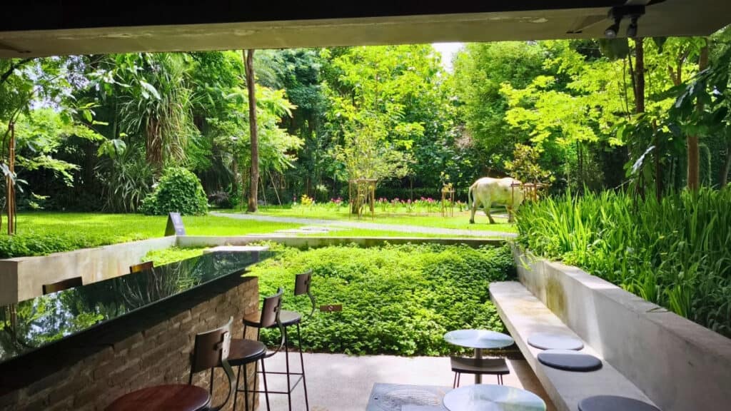 ถัดจากคาเฟ่ไปไม่ไกล จะเจออาคารเล็กๆ สุดมินิมอล ที่ชื่อว่า “เตาชา” ความเก๋ของที่นี่คือการออกแบบให้ที่นั่งจิบชาอยู่ต่ำลงไปในระดับพื้นดิน ทำให้มุมมองของเราอยู่ใกล้ชิดกับสวนสวยด้านนอกมากขึ้น เป็นการสร้างประสบการณ์การดื่มชาที่สงบและแตกต่างอย่างแท้จริง