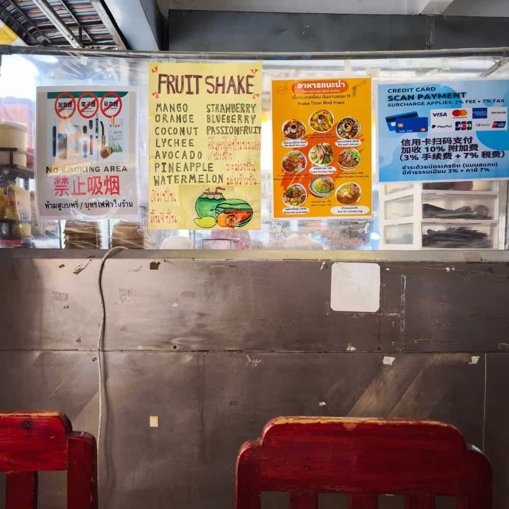 อย่าคาดหวังความหรูหราจากร้านนี้ ที่นี่คือร้านห้องแถวห้องเดียว โต๊ะไม้สีแดงน้ำตาลเข้มๆ บรรยากาศเรียบง่าย เปิดพัดลมระบายอากาศตามสไตล์ร้านก๋วยเตี๋ยวคลาสสิก แต่โลเคชั่นคือใจกลางนิมมานฯ เลยนะเพื่อน! ด้วยความที่ย่านนี้คนจีนและฝรั่งเยอะ เมนูและป้ายต่างๆ ในร้านก็เลยมีภาษาจีนและภาษาอังกฤษกำกับไว้ด้วย