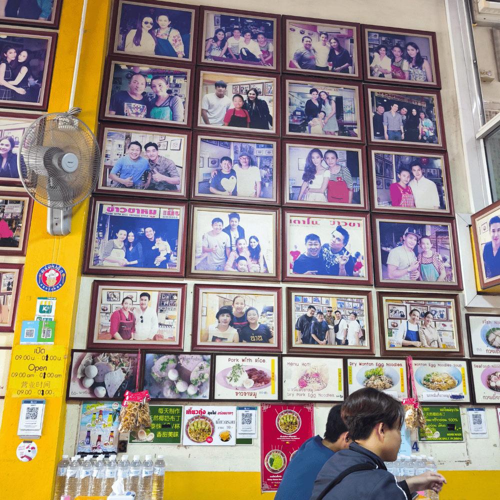 เข้าร้านปุ๊บ โดนตาเลย! ผนังทั้งร้านอัดแน่นไปด้วย รูปดารา คนดัง เซเลบฯ ทั้งวงการ ตั้งแต่รุ่นพ่อยันรุ่นลูก ถ่ายกับเจ้าของร้านรัวๆ จนเหมือนแกลลอรี่มินิ ๆ ที่คนดูไม่เบื่อ