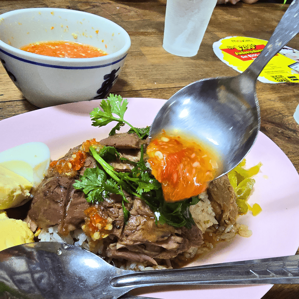 ทีเด็ดคือ น้ำจิ้มพริกกระเทียมตำสด เปรี้ยว แสบ เผ็ด ดึงรสขาหมูให้มันทะลุจอ กลิ่นเตะจมูก รสเตะใจ ยิ่งคนชอบรสจัด เอากระเทียมสด กับพริกสด ใส่เข้าไปนะ กินแล้วฟินเหมือนถูกหวย!