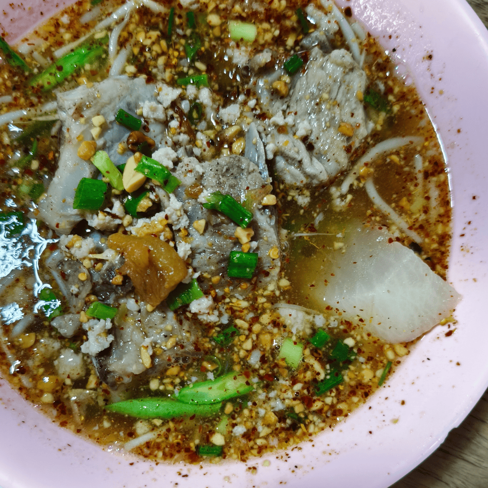 กระดูกอ่อนที่ใส่มา เปื่อยจนไม่ต้องเคี้ยว แค่เอาลิ้นดันก็ละลายหายไปเอง เส้นเล็ก เส้นหมี่ เส้นอะไรก็แล้วแต่ ขอแค่มีน้ำซุปนี้กับกระดูกอ่อนบวกถั่วลิสงบดและกระเทียมเจียว กรุ่นๆ บอกเลยว่า เลิกกันกับบะหมี่แห้งที่เคยรักไปเลย